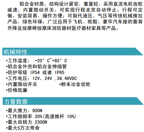 鋁合金材質(zhì),結(jié)構(gòu)設(shè)計(jì)緊密,重量輕,采用直流電機(jī)齒輪 減速,內(nèi)置微動(dòng)開(kāi)關(guān),可實(shí)現(xiàn)行程走完自動(dòng)停止; 機(jī)械特性:
