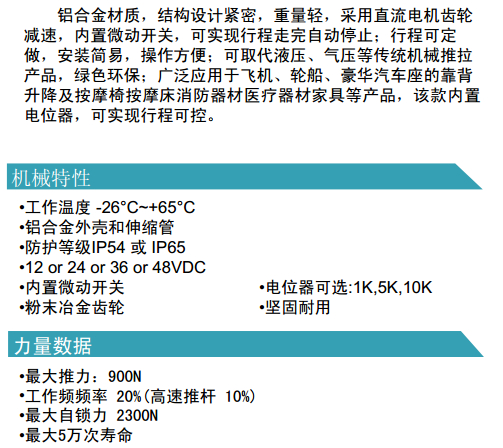 鋁合金材質(zhì),結(jié)構(gòu)設(shè)計(jì)緊密,重量輕,采用直流電機(jī)齒輪減速,內(nèi)置微動(dòng)開關(guān),可實(shí)現(xiàn)行程走完自動(dòng)停止;行程可定做,安裝簡(jiǎn)易,操作方便;可取代液壓、氣壓等傳統(tǒng)機(jī)械推拉產(chǎn)品,綠色環(huán)保;廣泛應(yīng)用于飛機(jī)、輪船、豪華汽車座的靠背升降及按摩椅按摩床消防器材醫(yī)療器材家具等產(chǎn)品,該款內(nèi)置電位器,可實(shí)現(xiàn)行程可控。